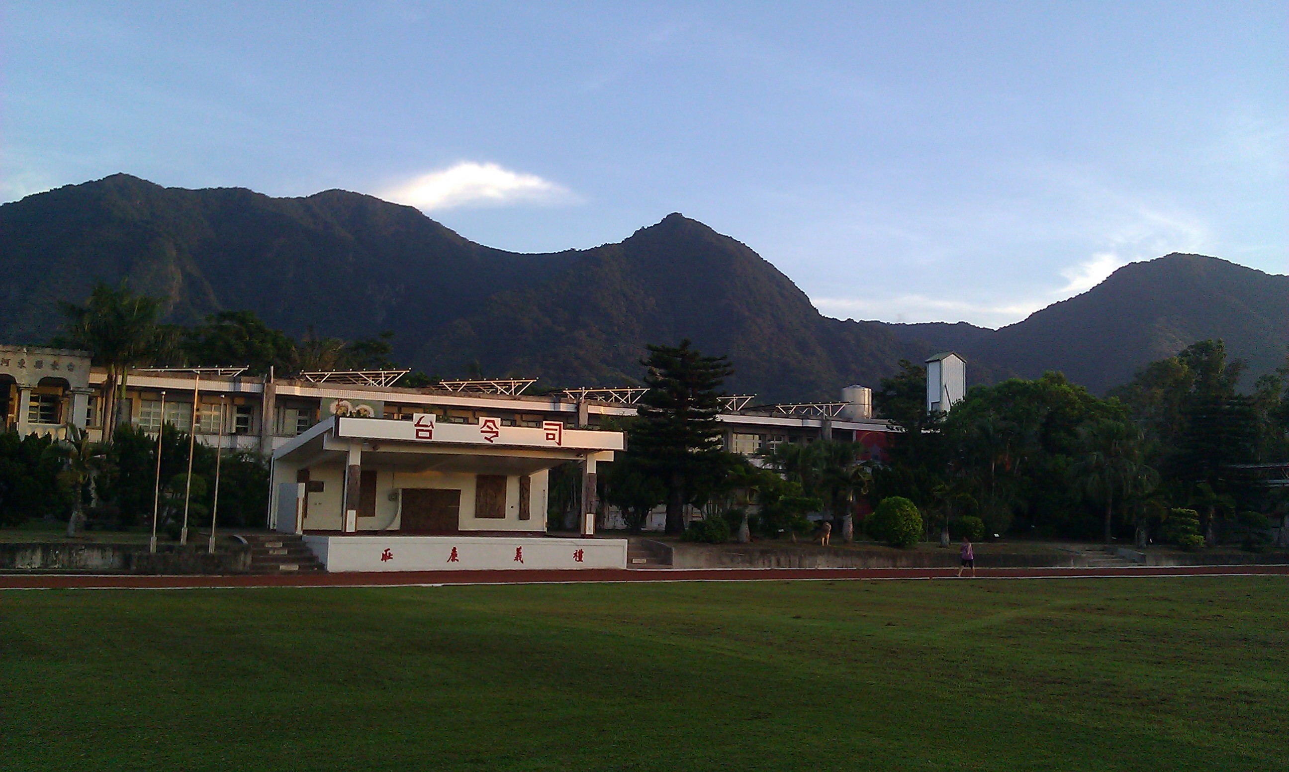 like schools throughout taiwan, the elementary school is furnished with a track and a large courtyard in front of the school buildings. an official viewing stand (司令台 literally “commander’s platform”) occupies the high position facing this courtyard, shaded for the principal and other notables to gaze over the students assembled in ranks in the courtyard. architecturally, the official viewing stand not only occupies a commanding position of the school courtyard. during the KMT oligarchy (1945-1987) these structures also contained moral and political slogans, images of the national territory or flag of the republic of china, and portraits of national father sun yat-sen and president chiang kai-shek. official viewing stands thus interpellated students within the ideological and scale making projects of the KMT state. in addition to the official viewing stand, bronze statues or busts of president chiang and confucius often occupied prominent positions toward the front of the school courtyard. students coming and going to school were encouraged to doff their hats and bow to the chiang statue as they entered or left school
