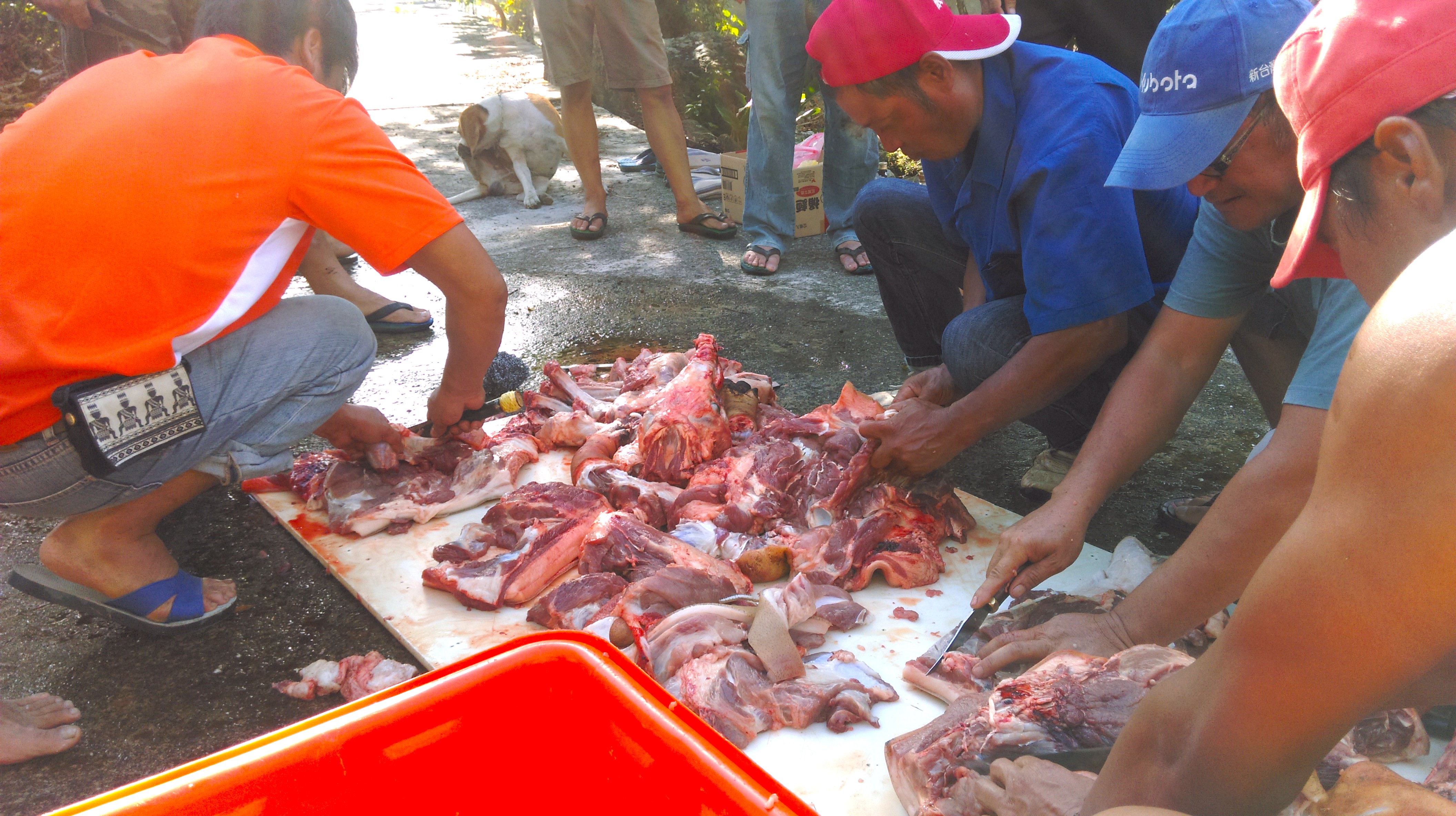 the members of an age set with some experience rapidly butcher the pig, sorting the meat into types. meanwhile, the age set’s women (a category that will now include women of an approximate age as the men in the age set as well as wives and unmarried daughters of the age set’s men) wash the internal organs and intestines. most of the intestines and the stomach are salted and held in reserve to make siraw, a preserved pork dish savored at banquets. as the men butcher, men of younger age sets often pour drinks or assist. my age set, lakancin, was a thirsty band and sent a youth more than once to fetch a couple six packs of taiwan beer