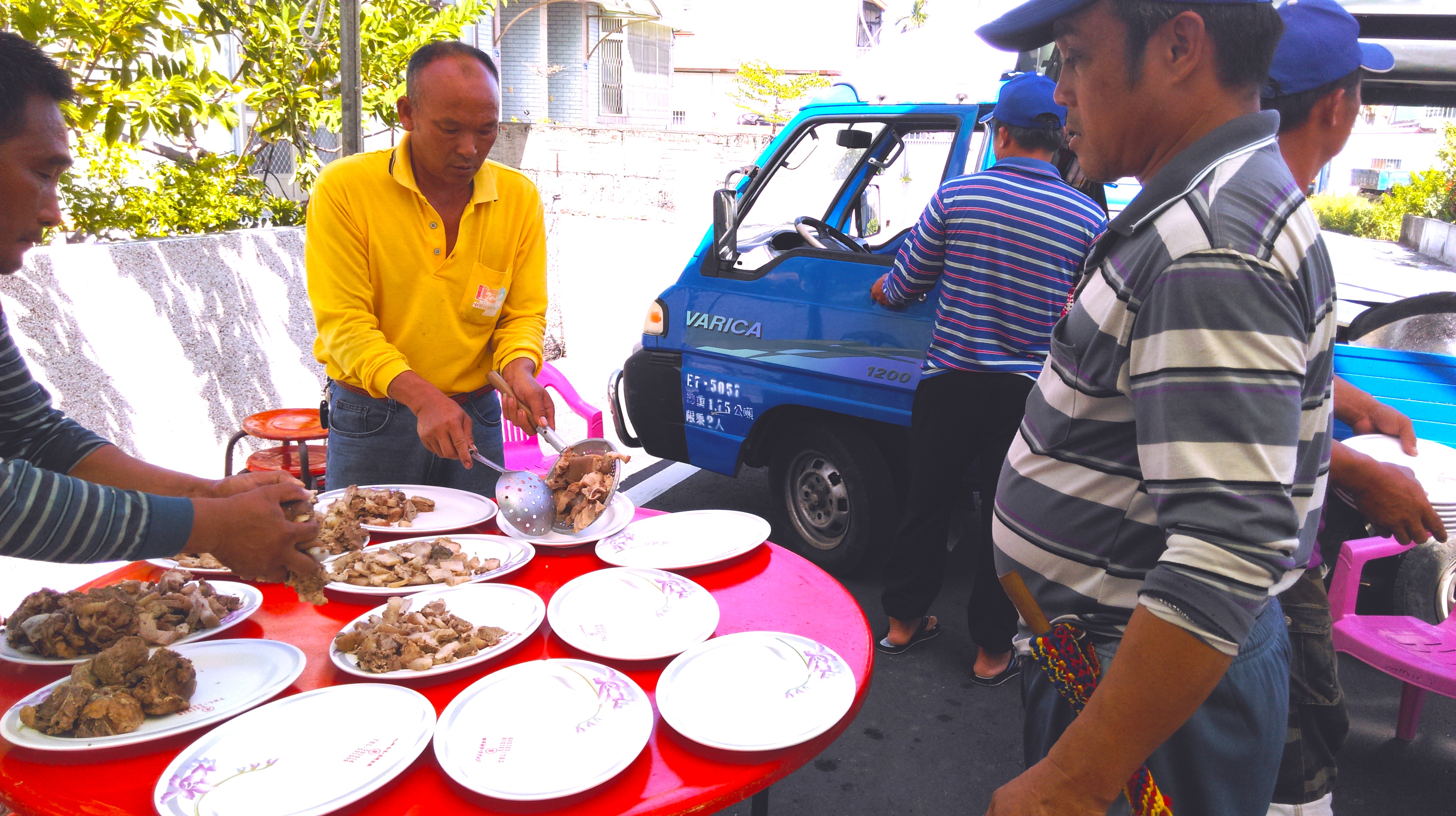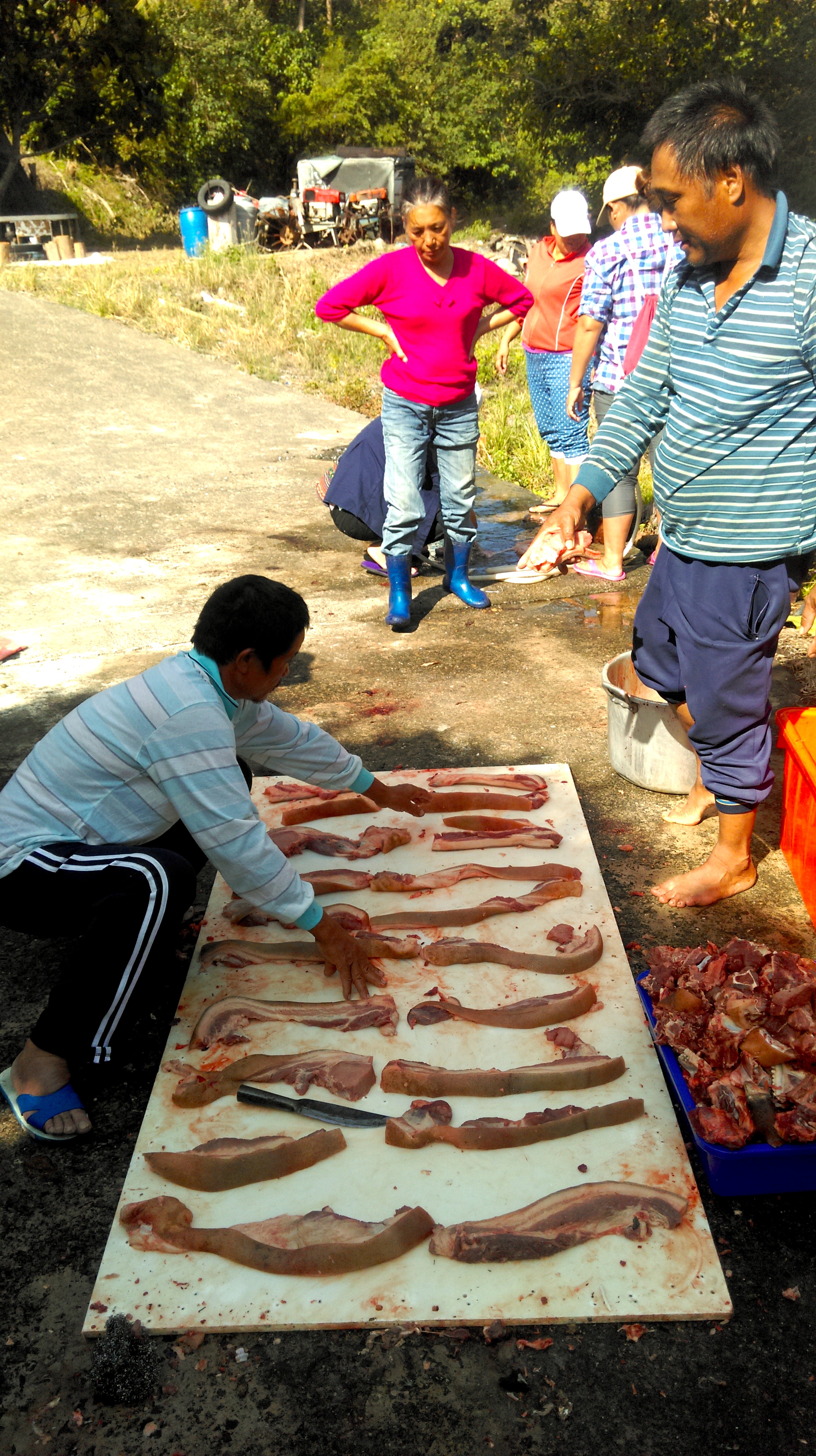 with the meat divided into categories, the work of sharing meat begins. those responsible for butchering lay out the best of the meat, strips of lean meat alternating with fat and ending with skin from the pig’s belly, and begin to divide the meat into equally sized portions. this meat can be boiled or stewed, but is particularly good for roasting over wood or charcoal fire. at the double ten pig killing, lakancin’s kaici (financial officer or accountant) decided that we should create 35 portions of meat. shares went to those who contributed to the kapot or to the event. the shares were equal sized. each kapot member received at least one share, but some at the event take more shares depending upon their work: siki, for example, received one share as a kapot member and another share for use of his truck to carry the pig; my ina received a share as my mother and another for her work in providing beer and steaming red beans and glutinous rice for the banquet. the shares correspond not to individual persons but responsibilities personified (“for the kapot,” “for the truck,” “for holding the pig during the slaughter”), here also objectified as strips of pork belly. these shares, which are distributed among a kapot and to the kapot’s helpers (the youth assisting at the event also received a share), always go to the shareholders as raw meat