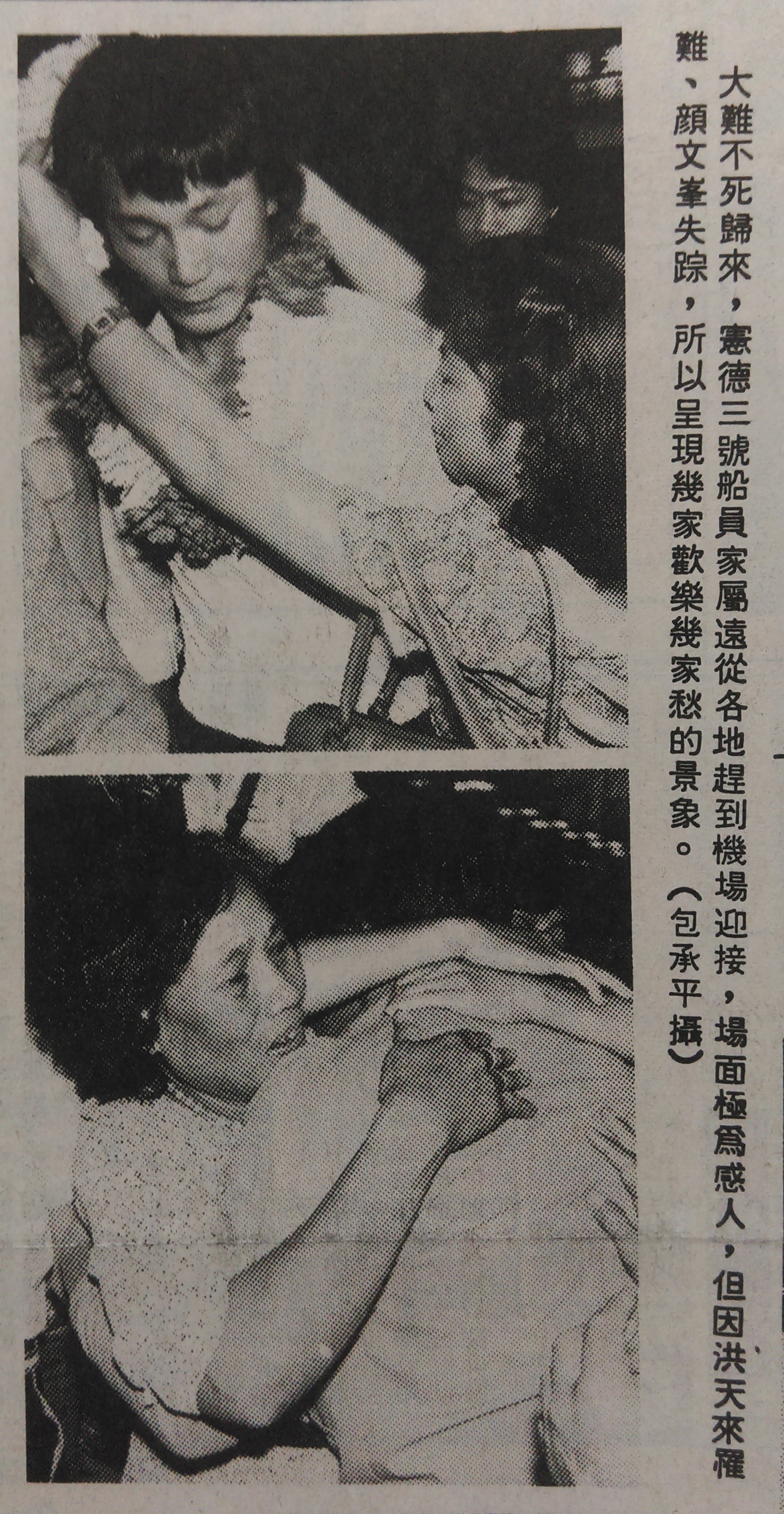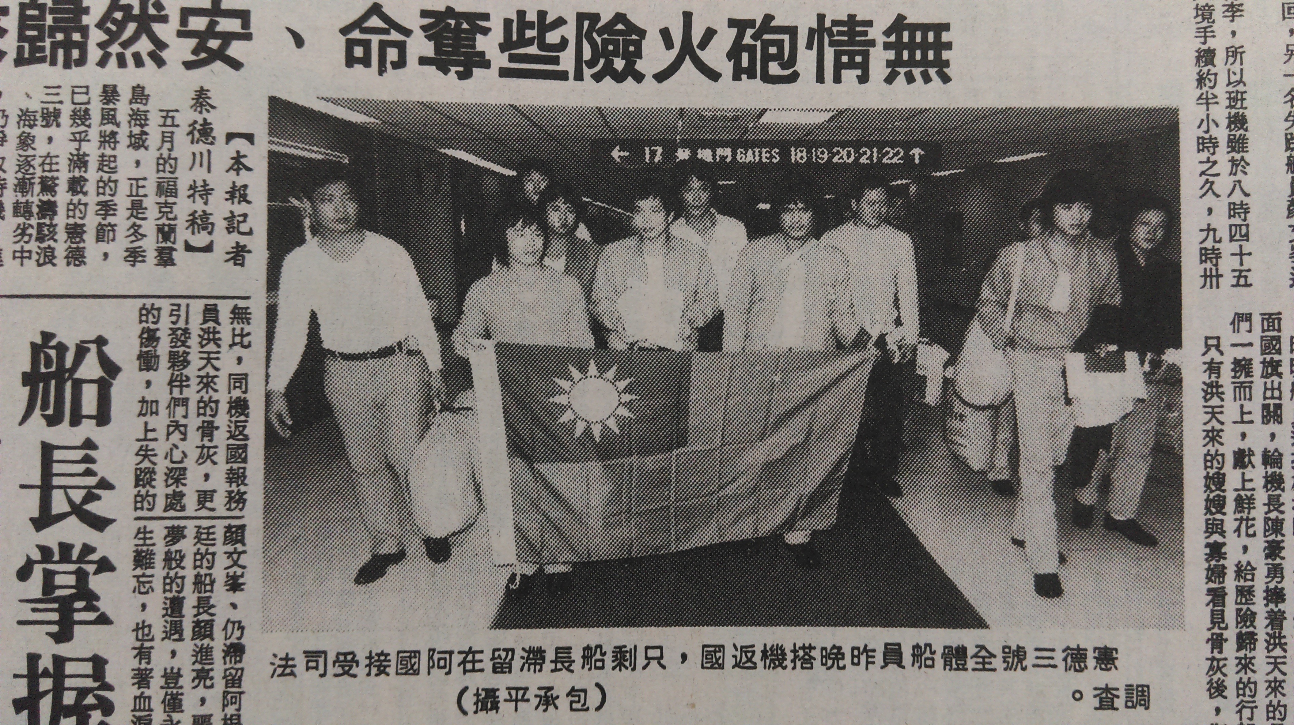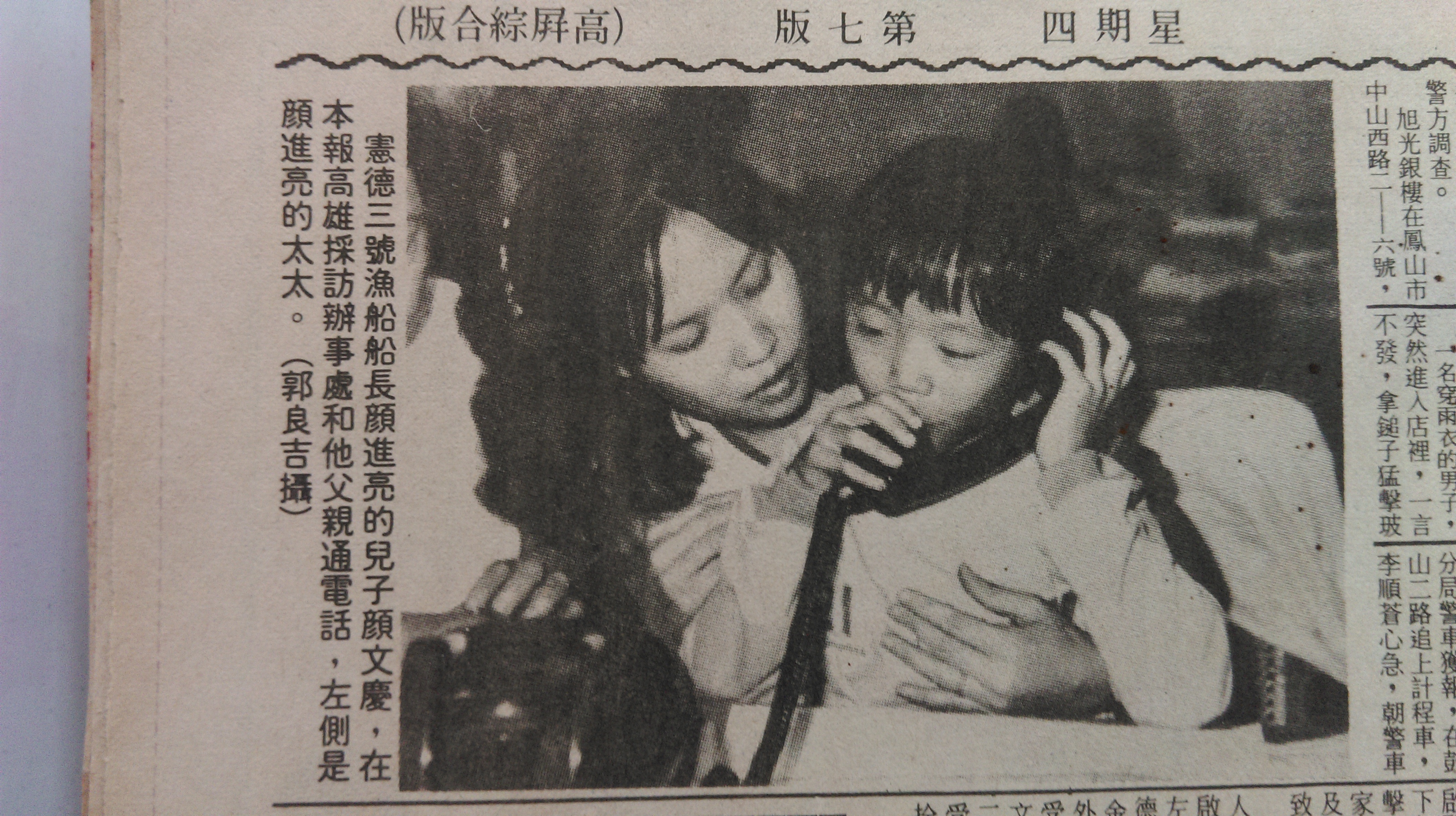 it’s not clear to me whether in carrying the flag, the crew was making a bid for recognition of their travail as part of an ongoing national struggle; of course, there are many kinds of emotions bundled in the “white sun set in a clear sky above a bloody ground.” besides, newspapers also reported on the human interest side of the story: how the widows of the men who died in the incident responded to the news, the terror felt by the crew during the attack on their boat, and the joyful feelings of return. because of the newspaper format, these kinds of stories get juxtaposed with each other, as in the following image from the now defunct kaohsiung based newspaper, taiwan times