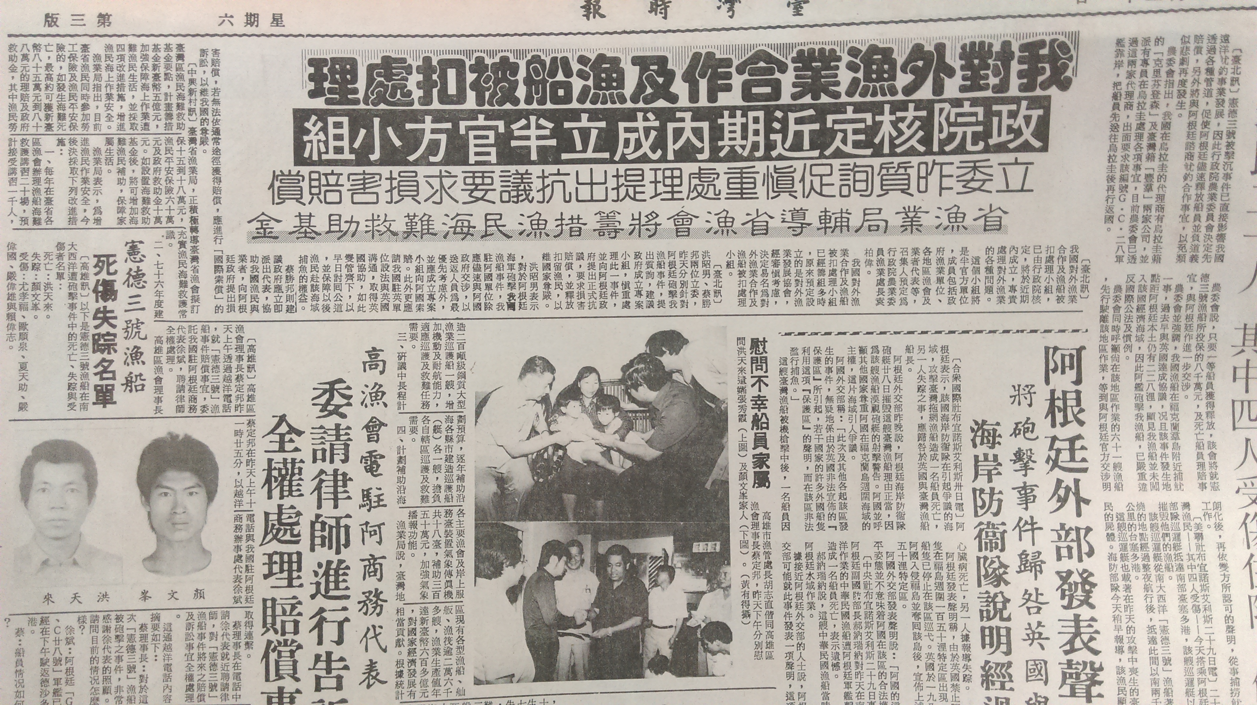 take the case of the chian-der #3 (憲德三號), a longline squid boat working waters claimed by argentina but part of a british claims around the falkland islands. on 30th may 1986, an argentinian coast guard ship attacked and sank the chian-der #3. two deaths and several casualties resulted. those surviving the attack were imprisoned in argentina for a two weeks before returning to taiwan. the incident, aggravated as it was because of the uk – argentina disputes surrounding the falklands, immediately became a larger story than just a taiwanese one. reported in the guardian, by the ap, and in el pais, as well as the taiwanese press, the attack was one of the only times taiwan entered international news in 1986.